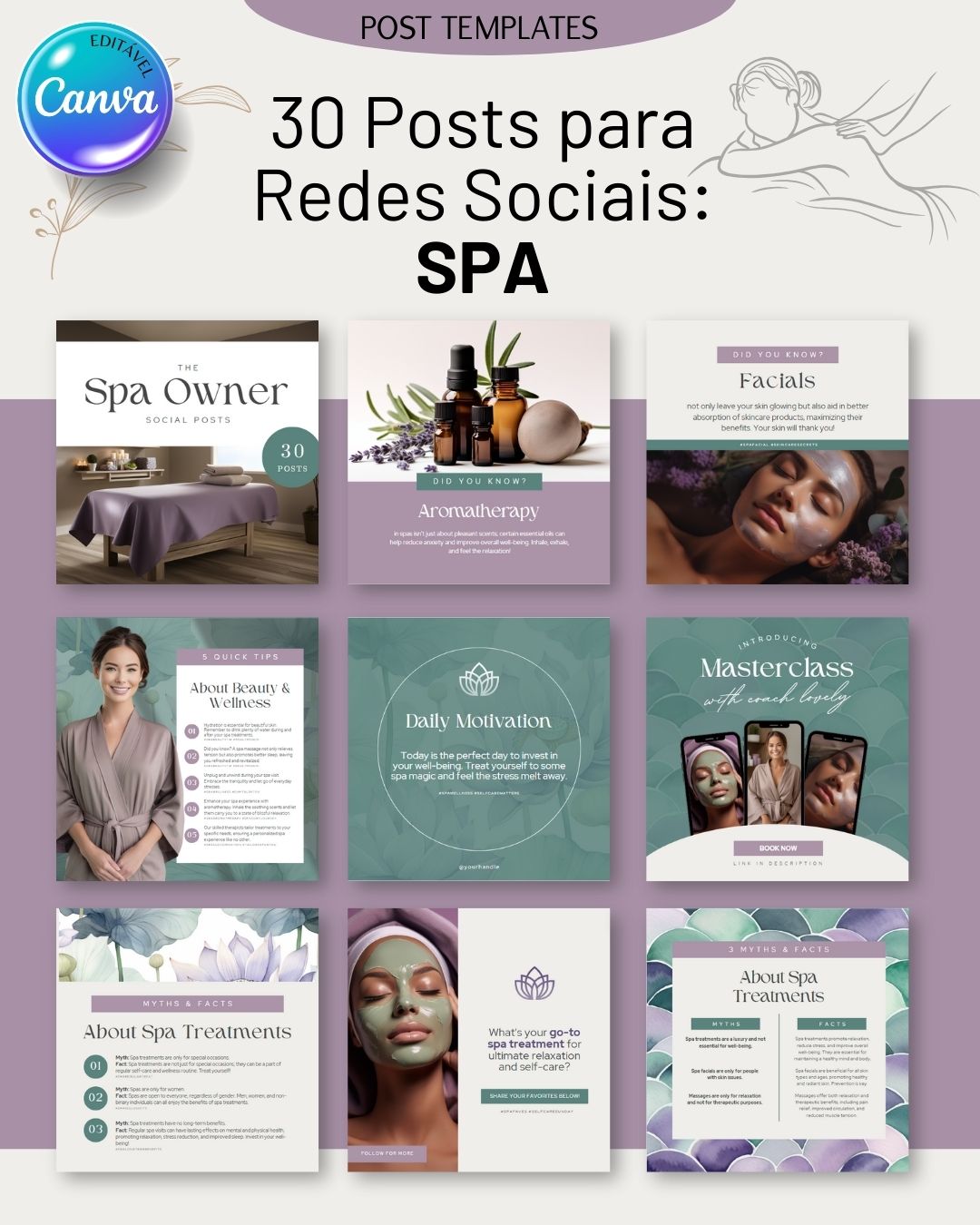 Divulgue seus tratamentos e ofertas especiais com os “30 Posts para Redes Sociais: SPA”. Personalize os templates no Canva e crie um feed visualmente relaxante e informativo.