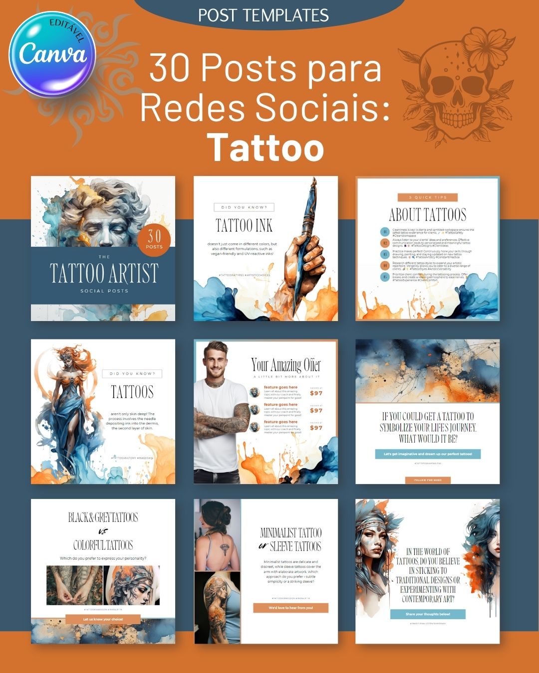 Compartilhe seus trabalhos e promoções com os “30 Posts para Redes Sociais: Tattoo”. Personalize os templates no Canva e crie um feed visualmente impactante e artístico.