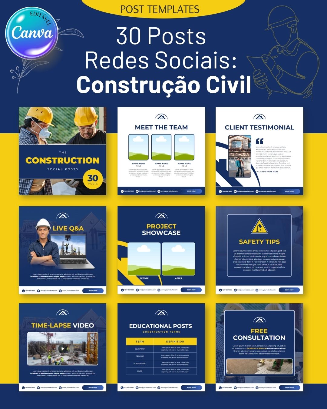 Promova os seus serviços com os “30 Posts Redes Sociais: Construção Civil”. Personalize os templates no Canva e crie um feed profissional para a sua empresa.