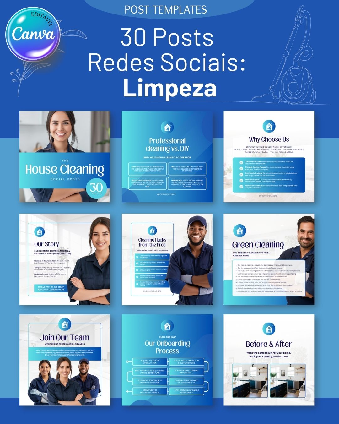Promova os seus serviços com os “30 Posts Redes Sociais: Limpeza”. Personalize os templates no Canva e destaque-se nas redes sociais.