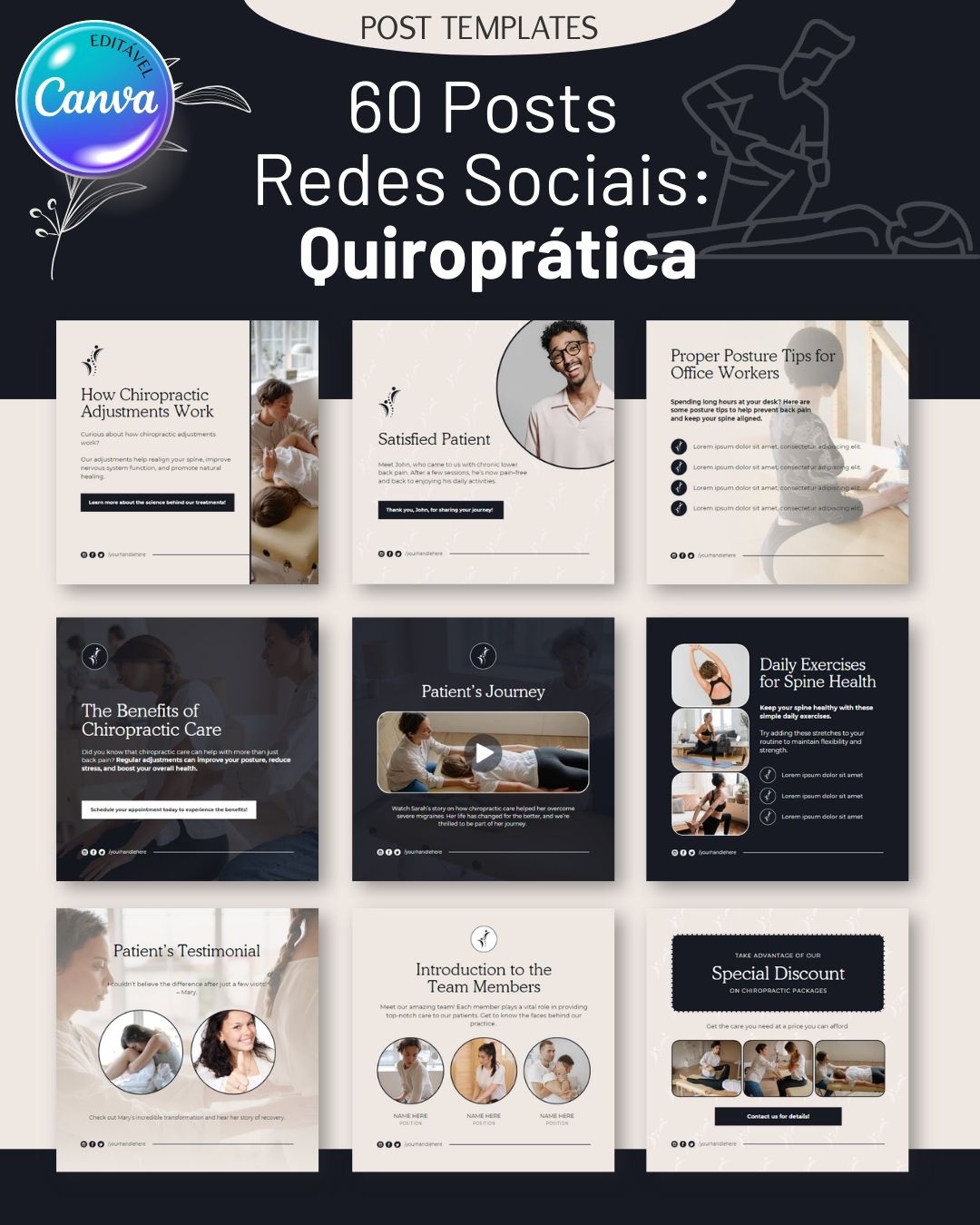 Eduque o seu público com os “60 Posts Redes Sociais: Quiroprática”. Personalize os templates no Canva e promova os benefícios da quiroprática.